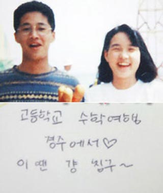 照片中的車太賢與崔錫恩每人手拿三個熱狗露出燦爛笑容,照片的背面寫著:“高中旅行在慶州♡。這時還只是朋友~!