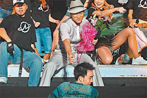 片段一開始就見華仔在臺邊唱歌,其間一位男歌迷沖破兩道圍欄,趨近臺前送花。華仔邊唱邊笑著彎下身子,跟對方握手,并接過他的花。