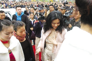 關(guān)之琳性感代言樓盤眾人圍觀 為防走光捂胸(圖)