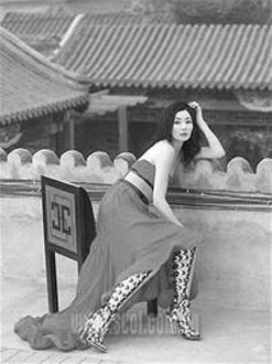這里是古老的北京,被包圍得如同衣袋里的手帕,屋頂?shù)耐咂懽兂汕嗌驮鹿馐念伾>褪窃谶@里,張曼玉套上巴黎世家、普拉達(dá)、迪奧和Balmain,正在自如地演繹模特的角色。她雀躍地穿著飾有羽毛的中式領(lǐng)少女裙裝,蝴蝶夫人式套裝,少婦束腰外衣。這位著名演員的形象呈現(xiàn)出一種糅合了優(yōu)雅、嚴(yán)肅與狂野的風(fēng)格。很難給她歸類(lèi),她拍過(guò)75部電影,精通所有的電影類(lèi)型。