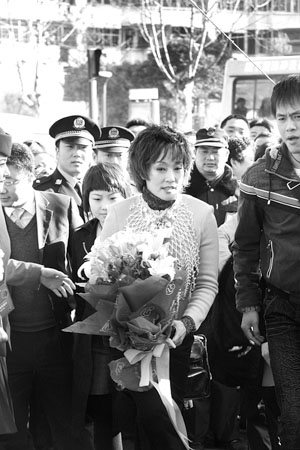 至10時(shí)15分慶典儀式完畢,人群仍然不肯散去!胺凑歼t到了,打電話請個(gè)假吧!再等等,她還會(huì)出來!