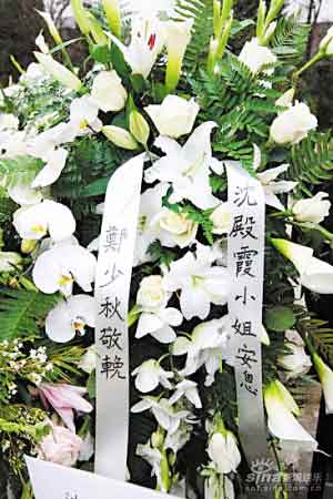 據(jù)悉,肥姐靈堂屬西式布置,十分簡潔莊嚴,靈柩全封,不設(shè)瞻仰遺容儀式。喪禮由岳華任司儀,欣宜致辭。肥姐的西式淺啡色靈柩擺在堂前中央位置,后面背景全是花圈,秋官的花圈也在花堆中并非在顯眼位置,靈柩上面則擺著欣宜敬挽的白玫瑰及白蝴蝶蘭花圈。其后,鄭欣宜與約30、40位近親好友為肥姐守夜,儀式約兩個小時。