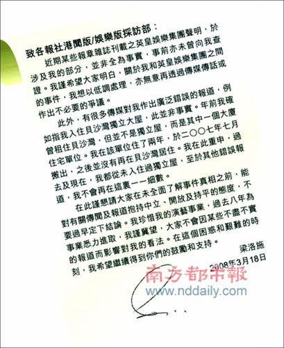 3月18日晚,梁洛施向香港各大傳媒發(fā)出聲明,強調(diào)英皇日前所發(fā)聲明并非全為事實,事前也沒向她求證:“我謹(jǐn)希望大家明白,關(guān)于我和英皇娛樂集團之間的事件,我想以低調(diào)處理,也無意再通過傳媒傳話或作出不必要的爭議!