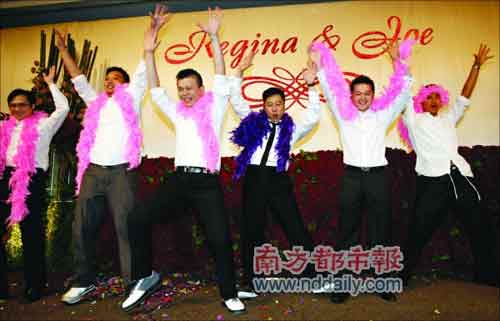 而新郎馬偉豪為了這場(chǎng)婚禮花了不少心思,除了以電影的形式記錄戀愛(ài)過(guò)程外,還瞞著新娘專門和兄弟們排演了一場(chǎng)“艷舞”在婚宴上表演,就為給新娘一個(gè)大大的驚喜。看著“小馬哥”在臺(tái)上扭腰挺胯搔首弄姿做出一個(gè)個(gè)“嫵媚”的姿勢(shì),新娘和嘉賓都笑得前仰后合。這場(chǎng)婚宴從晚上6點(diǎn)半一直持續(xù)到深夜近12點(diǎn),賓主才盡興而歸。