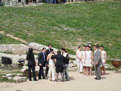 火炬點(diǎn)火儀式于當(dāng)?shù)貢r間24日11:00開始,10:40,章子怡作為第一位中國嘉賓來到了古奧林匹克運(yùn)動場,頓時得到了在場全體中國人的掌聲和歡呼。她身穿一襲中西合璧的露背白色禮裙,身份卻是記者。儀式結(jié)束后,最高女祭司娜芙普利都和眾祭司正在離開運(yùn)動場,章子怡見到娜芙普利都,上前打招呼,并和最高女祭司、編導(dǎo)以及眾多女祭司一起合影留念。