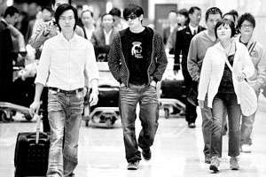“周杰倫,是周杰倫,還有潘瑋柏!敝芙軅惡团爽|柏出現(xiàn)在新建的機(jī)場(chǎng)三號(hào)航站樓時(shí),引起一陣騷動(dòng)。