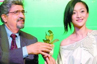 “大使”周迅首先給記者們“上了一課”:主辦方贈與每位與會者一盆小的盆栽植物,周迅拿起來看了看,說“綠色代表希望,這盆小植物是活的,請大家像愛護(hù)自己一樣愛護(hù)這個地球!苯又蝗灰庾R到什么,她揭去了植物外面包裹著的塑料袋并說道,“在生活中,我們盡量不要使用塑料袋。”