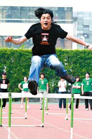 導(dǎo)演張揚穿牛仔褲跨欄 英姿勃發(fā)不輸劉翔(組圖)