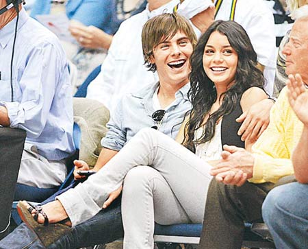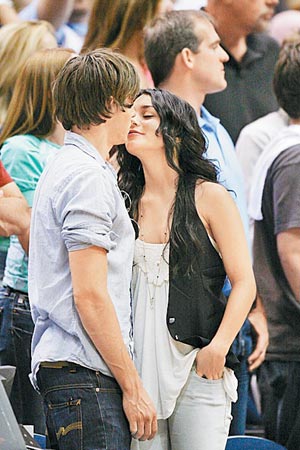 中新網(wǎng)5月13日電 迪士尼頻道人氣歌舞劇電影《歌舞青春》第三集近日于鹽湖城正式開鏡,男主角扎克·埃夫。╖ac Efron)與同片女友凡妮莎·哈金斯(Vanessa Hudgens)昨日一起欣賞NBA球賽,還旁若無人地在觀眾席上接吻。