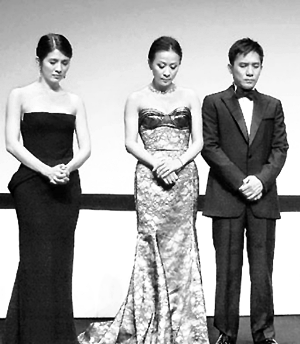 在放映前,三位主要演員楊采妮、劉嘉玲、梁朝偉為震災(zāi)遇難者默哀。