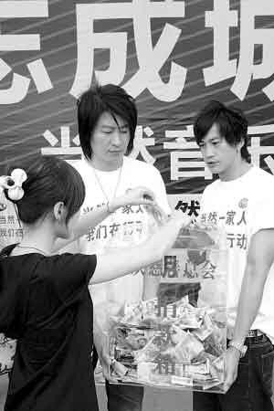 昨天,游鴻明、何潤東、陳怡蓉、沈建宏、鄧寧、劉錫明、阿清、高磊、晨辰等當(dāng)然音樂的歌手抵達重慶。他們帶著70余萬元的救災(zāi)物資和9顆愛國之心在重慶街頭為汶川地震的災(zāi)后重建募款。在重慶石橋鋪佰騰數(shù)碼廣場、沙坪壩步行街、江北北城天街三個募捐點,累計3小時的募款活動中,何潤東等9位藝人共籌集善款187400余元,目前這個數(shù)字還在不斷增加。