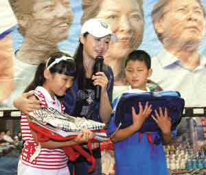 著名影視明星曹穎前天來(lái)到南京參加兒童電影《同一片藍(lán)天》的首映式,這部電影著重反映外來(lái)工子弟學(xué)生精神風(fēng)貌。即日起將向全國(guó)中小學(xué)生公益放映。圖為曹穎在首映式上向從四川受災(zāi)地區(qū)來(lái)寧讀書的王天幸、馬瑩雪轉(zhuǎn)贈(zèng)學(xué)習(xí)用具。安福 婉愉 攝