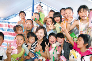 演員陳好除參加多場義演投身抗災事業(yè)外,6月1日更到都江堰親手為災區(qū)的小朋友獻上特別的禮物。當日,陳好(與災區(qū)小朋友一起過六一)先后趕往西南財經(jīng)大學、都江堰的兩個受災群眾安置點,為兩個地方的小朋友帶去玩具作為兒童節(jié)禮物,并與他們聊天、談心。一個震后因為懼怕和外界交流、一直不肯上幼兒園的小女孩,在陳好的勸說下,不僅愿意繼續(xù)學業(yè),還送給陳好一個香囊,讓陳好感動不已。陳好表示:“我只是想盡自己的一份心意,但沒想到,在贈予他們禮物的同時,還會有小朋友給予我回贈,我會一直保存下去!标惡靡餐ㄟ^媒體呼吁、號召大家多捐課桌椅和文具用品。