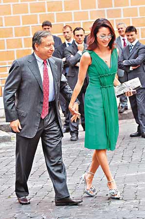 中新網(wǎng)6月17日電 楊紫瓊與法籍未婚夫Jean Todt上周去到意大利羅馬,出席意大利富商Flavio Briatore與Elisabetta Gregoraci的婚禮,身穿綠色連身裙的楊紫瓊,與JeanTodt手拖手步入堂觀禮,盡顯恩愛。