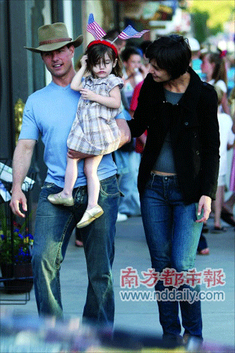 阿湯哥生于1962年7月3日,美國國慶日那天正好是他46歲生日的第二天。他一身西部牛仔裝扮,抱著寶貝女兒蘇瑞走在大街上,不時向圍觀的粉絲打招呼,也任身邊的狗仔隊拍照。然而,當(dāng)天的明星卻不是阿湯哥,而是他懷里2歲的小蘇瑞。蘇瑞戴著一個紅色發(fā)卡,上面插著兩面美國國旗,造型十分趣怪。尤其當(dāng)她在明星老爸懷里揮舞雙臂的時候,是街上十足的焦點人物。媽媽凱蒂一身黑衣十分低調(diào),她不時低頭跟女兒說話,有時也主動向在場的狗仔隊?wèi)c!皣鴳c快樂”。