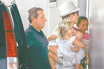 皮特(左三)日前抱兩個女兒到醫(yī)院看茱莉,保鏢(左一)在旁護駕。
