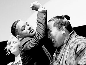 黑人巨星威爾·史密斯在《全民超人漢考克》中無所不能,不過到了現(xiàn)實生活中可沒那么威風,不但不能舉起汽車,甚至連日本相撲手的腕子都掰不動。