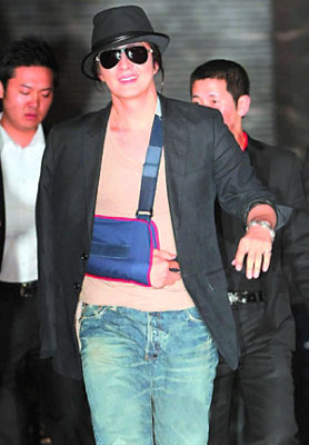 韓國男星裴勇俊之前因為拍劇集《太王四神記》而受傷,本月初接受肩韌帶手術(shù),日前他終于首度公開露面,現(xiàn)身首爾捧老友蘇志燮新片《電影是電影》。戴著墨鏡的裴勇俊雖然包扎著右手,但精神不錯,還和fans揮手。