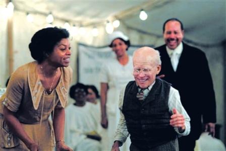 《本杰明·巴頓奇事》是一部劇情怪誕的影片。影片的男主人公是個(gè)叫本杰明·巴頓的怪人(布拉德·皮特飾),他一生下來就是個(gè)滿頭華發(fā)、一臉褶子的古稀老頭(劇照中皮特的體型很小,估計(jì)是個(gè)“老嬰兒”)。可奇怪的是,他的生物鐘是倒著走的——?jiǎng)e人越活越老,他卻越活越小。巴頓1919年出生,不經(jīng)意間愛上了一個(gè)名叫黛西的6歲女孩,30年后,兩人終于“長(zhǎng)”得年齡相仿了。他們彼此相愛,度過了人生中最美好的一段時(shí)光。皮特在化裝和特效的幫忙下,變成了一個(gè)貌似被風(fēng)干的小老頭,形象十分驚人,與壯碩的皮特判若兩人。 欣聞