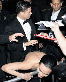 影迷們見(jiàn)到兩位明星瘋狂吶喊,蜂擁而上期望與偶像近距離接觸,結(jié)果茱莉被人流擠得動(dòng)彈不得,緊抓欄桿向老公求救,卻依然面帶笑容保持風(fēng)度。皮特把影迷們丟到了一旁,趕忙過(guò)去搶救茱莉。記者張碩