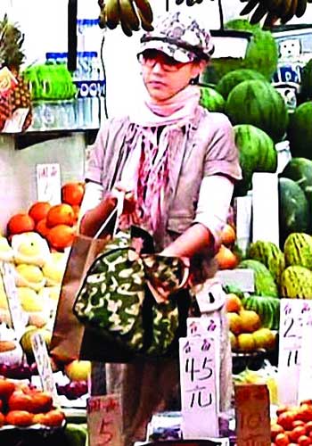 不知道她這身莫名其妙的打扮是否過(guò)分“獨(dú)特”,身旁一名女子也不禁打量她,但周海媚不予理會(huì)。之后周海媚再到附近一間水果店買櫻桃(右圖),付款后,她邊走邊把櫻桃放進(jìn)手袋內(nèi)離開。
