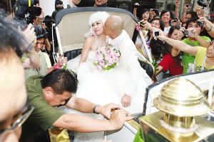 昨天下午馬尼拉的天氣有些陰沉,較為涼爽。由于張衛(wèi)健和張茜都是虔誠的天主教徒,兩人的婚禮也按照傳統(tǒng)的天主教婚禮進(jìn)行。圣奧古斯丁大教堂是馬尼拉當(dāng)?shù)刈罟爬系慕烫,距今已有五百多年的歷史。雖然張衛(wèi)健和張茜的婚禮在此舉行,但是教堂內(nèi)部并沒有進(jìn)行更多特別的布置,只是在紅毯兩旁每隔十米擺放了一個(gè)高達(dá)兩米的綠植,枝干部分則是由不同顏色的玫瑰組成的大團(tuán)花束,充滿了宗教婚禮的神圣莊嚴(yán)。下午兩點(diǎn)一刻,身穿白色禮服的張衛(wèi)健和媽媽先行到達(dá)圣奧古斯丁大教堂。大約一刻鐘后,張茜也在媽媽的陪同下乘坐馬車來到教堂。張茜身穿一襲曳地銀白裹胸婚紗,紗裙上點(diǎn)綴著白色花瓣,隨著走動(dòng)的步伐上下擺動(dòng),充滿動(dòng)感,而她上半身綴滿的水晶則將整個(gè)人襯托得高貴非常。值得一提的是,張茜當(dāng)天的造型由著名形象設(shè)計(jì)師陳非一手打造,團(tuán)簇的頭紗下白色的假發(fā)別具一格,和白色婚紗相得益彰。