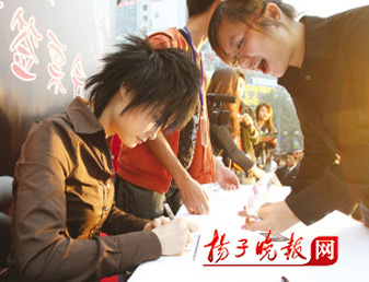 很多玉米都是有備而來(lái),除了相機(jī)、海報(bào)還帶來(lái)了給李宇春的禮物,有玩具、靠墊、掛飾……記者注意到一個(gè)小朋友一手牽著媽媽的手、一手抱著一個(gè)長(zhǎng)長(zhǎng)的盒子,到了李宇春面前很禮貌地打了個(gè)招呼,李宇春笑著摸摸他的頭,向這對(duì)母子說(shuō)了聲“謝謝”并接過(guò)了他們的禮物。“我兒子今年5歲,他和我一樣也是玉米,春春的《Give me five》、《下雨》他都會(huì)唱”,從臺(tái)上下來(lái)后媽媽和記者聊起來(lái),記者問(wèn)到禮物,她很認(rèn)真地說(shuō):“是一盒麻花。我們是從天津趕過(guò)來(lái)的,跟單位請(qǐng)了年假,打算一直在南京待到春春演唱會(huì)結(jié)束。那是一根長(zhǎng)一米的麻花,有寓意的,因?yàn)椤桓榛▋筛p’,春春的新專輯有11首歌,每首歌間都是有聯(lián)系的,就希望新專輯像這根麻花一樣……”