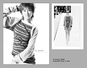 最近,“玉米”們很費(fèi)心思地做了一系列圖片,主題是他們家春春穿著各大名牌的衣服和模特的對(duì)比圖。結(jié)果我們發(fā)現(xiàn),李宇春真的能把許多衣服穿出自己的感覺,并且不僅僅是中性。想象一下李宇春穿香奈兒套裝會(huì)是什么樣子?模特走秀時(shí)穿的這系列成衣都是香奈兒家典型的纖細(xì)優(yōu)雅風(fēng),而同樣的衣服穿在李宇春身上,則多了幾分青蔥少年的特質(zhì)?纯雌渌恼掌,我們可以發(fā)現(xiàn)除了像香奈兒和GUCCI等大牌成衣,最近幾年流行的Y-3和Comme des Gargons等潮牌也是她的最愛,除此之外還有稍微平價(jià)些的牌子,比如Diesel和Miss sixty,雖然玉米們的意思是為了證明李宇春穿得比模特好看,但是效果卻是絲毫沒有可比性,因?yàn)槔钣畲旱脑煨蛶熣娴氖怯靡路谝r托明星,而不是讓衣服穿人。