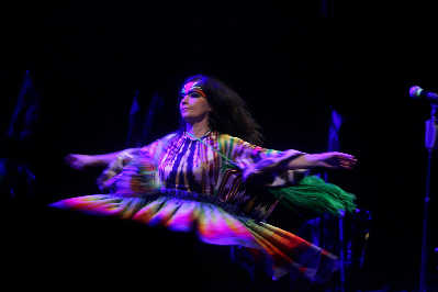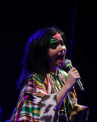 隨著去年發(fā)行的新專輯中主打歌《Earth Intruders》的音樂響起,比約克赤腳登場(chǎng),身上的服裝并不是此前在香港曝光過的那套“七彩唐僧裝”,而是一套新專輯封面照的真人版———紅黃藍(lán)綠的五彩大擺裙、緊身打底褲,那雙光著的大腳在現(xiàn)場(chǎng)藍(lán)色燈光的映襯下,呈現(xiàn)出一種略帶鬼魅氣息的熒光藍(lán)。簡(jiǎn)單的舞臺(tái)上空飄蕩著的五彩布上畫著各式動(dòng)物圖案———癩蛤蟆、蜥蜴以及咸魚;舞臺(tái)右側(cè)是她此次巡演備受矚目的女子銅管樂手們,人人頭上都插著紅色的旗幟。一曲唱罷,比約克興奮而干脆地用不標(biāo)準(zhǔn)的中文大聲說,“謝謝!”夾雜著觀眾中此起彼伏的口哨聲、掌聲和些許撕心裂肺的吼叫聲,現(xiàn)場(chǎng)從一開始就預(yù)示著即將到來一場(chǎng)回歸原始本能的熱情。