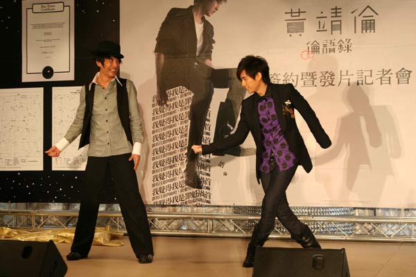 隨后記者會(huì)的重頭戲---簽約儀式正式開始,華納唱片大中華總經(jīng)理王蓓芬(帕梅拉)和黃靖?jìng)愐黄鹱叩奖嘲宓挠液蠓,兩人一同揭開星星布幕,亮出星型的合約書,在大家的見證下簽名,代表華納唱片正式簽下這位“超級(jí)星光大道”第三屆最閃亮的一顆星,并象征黃靖?jìng)悓⒊蔀楦鑹W耀的一顆星星,希望他用簡(jiǎn)單的歌聲打動(dòng)人心。帕梅拉大費(fèi)周張買了一顆價(jià)值1萬美金的“星星”當(dāng)做禮物送給黃靖?jìng),這顆特別為黃靖?jìng)愑嗁?gòu)的星星以黃靖?jìng)愑⑽拿癑ING”命名。收下了這個(gè)特別的禮物,黃靖?jìng)惛袆?dòng)的說不出話,不敢相信自己擁有了一顆“真的星星”。 除此之外,華納音樂更是準(zhǔn)備了另一項(xiàng)大禮:當(dāng)主持人宣布?xì)g迎知名舞蹈老師張勝豐出場(chǎng)時(shí),黃靖?jìng)愡有點(diǎn)訝異,原來是唱片公司認(rèn)為黃靖?jìng)悤?huì)唱又很會(huì)說話,但唯一欠缺的就是肢體動(dòng)作,在他身上總是會(huì)發(fā)現(xiàn)同手同腳、舞步不在節(jié)奏上的情形。然而,既然要發(fā)片成為正式的歌手,當(dāng)然不可以忽略這個(gè)部份。張勝豐老師搞笑地拿出節(jié)拍器當(dāng)場(chǎng)要黃靖?jìng)怱OLO一段舞步讓老師看看,臺(tái)下歌迷也不斷鼓噪著,黃靖?jìng)惛蠋煹氖痉秳?dòng)作做一次,果真很不協(xié)調(diào),完全不在拍子上,笑得杉哥在一旁大方宣布:“舞蹈集訓(xùn)沒有期限,讓靖?jìng)惿险n上到擺脫肢障封號(hào)為止。”逗得全場(chǎng)哈哈大笑。