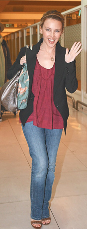凱莉身穿黑色西裝、紫紅色上衣、牛仔褲,輕便俏麗,襯著歌迷“Can't Get You Out of My Head”的歌聲,她在自己請的一名女性保鏢、主辦單位請的10名保全護(hù)衛(wèi)下離開機(jī)場,面對大批攝影記者幾乎貼近她臉的鏡頭,未顯任何不悅。