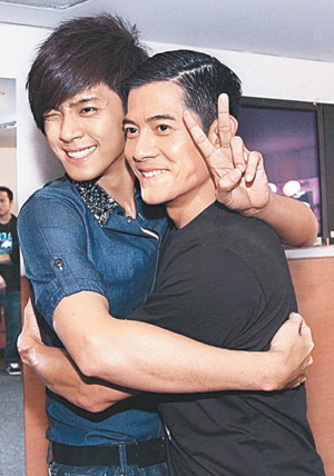 中新網(wǎng)12月19日電 臺(tái)灣“聯(lián)合報(bào)”報(bào)道,郭富城臺(tái)北演唱會(huì)圓滿落幕,在事后的慶功宴上,“小豬”羅志祥得以與“舞王”擁抱,他情不自禁做出勝利手勢(shì)。