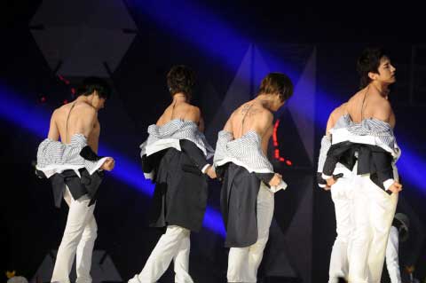 29日下午,“2008 SBS歌謠大典”在京畿道一山國際展覽中心(KINTEX)進(jìn)行了現(xiàn)場直播。節(jié)目當(dāng)天,東方神起在上臺(tái)演唱熱門歌曲《咒文》(MIROTIC)時(shí),在結(jié)尾處齊齊脫去上衣亮出了有型背肌,引得現(xiàn)場粉絲尖叫連連。