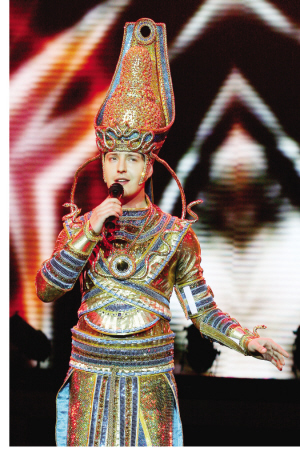 一曲唱罷,原本還是“未來風(fēng)”的維塔斯立馬換了一套“中國風(fēng)”的服裝——金燦燦的宮廷服裝,并用高音炫出一曲無歌詞作品《詠嘆調(diào)》。到了第三首作品,他則換上一身白衣,用標(biāo)志性的“海豚音”唱起填上了俄文歌詞的中國歌曲《大海啊,故鄉(xiāng)》。
