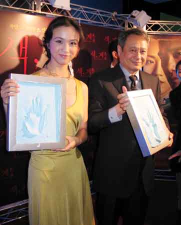 “中央社”報(bào)道說(shuō),李安和湯唯在影片“色•戒”的韓國(guó)發(fā)行商“C.J.娛樂(lè)公司”的安排下,今天下午六點(diǎn)半,冒著早冬的寒雨,走上龍山CGV戲院售票區(qū)的紅地毯,向圍守在現(xiàn)場(chǎng)的媒體記者、粉絲近四百人,和藹可親地握手答謝,并按捺了手掌印模,展現(xiàn)出極為熱誠(chéng)的態(tài)度。