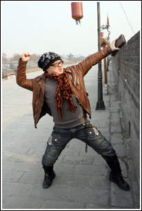 一身嬉皮風(fēng)格的裝扮,加上一副超大的黑框眼鏡,彭波看上去帶有明顯的“謝小盟后遺癥”。雖然只來(lái)過(guò)西安兩次,但彭波非常喜歡西安。去年在西安拍了一個(gè)多月電影,他已把城里好吃好玩的地方摸了個(gè)門兒清。他說(shuō):“好吃的太多,滿街都是美女。西安人爽快、實(shí)在,在這交了不少朋友,國(guó)力隊(duì)的江洪就是我哥哥。我已把這里弄得跟自己家一樣了,到處都特別熟!