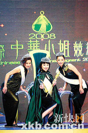 由香港TVB主辦的2008年度“國際中華小姐”(原名“國際華裔小姐”)競選決賽,前晚移師佛山舉行。本屆港姐冠軍張嘉兒又一舉拿下了“華姐”亞軍的頭銜,既在情理之中,也屬意料之外。而巴黎小姐朱璇,憑借出挑的外表和精湛的演技,最終取得了冠軍與“最青春小姐”兩個獎項。