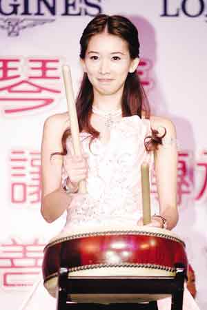 圖文:林志玲著粉嫩絲裙 敲大鼓賣(mài)表助弱勢(shì)兒童