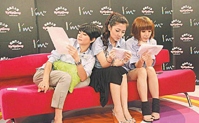 中新網(wǎng)9月26日電 S.H.E最近成立自己的網(wǎng)絡(luò)電臺(tái),其中有1天的節(jié)目和im.tv合作,讓粉絲能“看”到她們主持的模樣。準(zhǔn)備錄音時(shí),Hebe(右起)和Selina認(rèn)真研讀主持稿,只有Ella脫鞋又摳腳,還倒在Selina身上,坐沒(méi)坐相。這些畫(huà)面要是上網(wǎng)大放送,真會(huì)大傷形象。