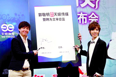 昨日,郭敬明簽約天娛儀式在北京舉行。此次郭敬明不僅成為藝人,還成為了天娛的文學(xué)總監(jiān)及創(chuàng)作總監(jiān)。對于之前一直傳出的郭敬明將出演《新流星花園》花澤類的消息,在發(fā)布會上,郭敬明予以否認。而天娛的負責(zé)人龍丹妮也表示目前還沒有和郭敬明談《新流星花園》的演出,不過郭敬明可能要在這部電視劇中客串一個小角色。