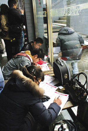 由于外地考生多,不少來(lái)報(bào)名的考生都是拖著行李直奔考場(chǎng),所以一些賓館也來(lái)到學(xué)院門(mén)口吆喝。附近煎餅攤兒的老板也樂(lè)開(kāi)了花,平時(shí)一天二三百元的買(mǎi)賣(mài)一下子翻番。記者 王瑜明
