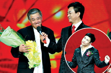 趙本山和小沈陽(yáng)的春晚小品《不差錢》,昨晚捧得了小品類觀眾最喜愛(ài)的節(jié)目一等獎(jiǎng),趙本山在得獎(jiǎng)感言時(shí)表示:“我最興奮的是,我兩個(gè)學(xué)生終于能站在這個(gè)舞臺(tái)上了,這讓我非常高興!毕噍^之下,倒是小沈陽(yáng)的得獎(jiǎng)感言很是簡(jiǎn)單,只有“感覺(jué)很美”四個(gè)字。按照慣例,獲獎(jiǎng)嘉賓要表演節(jié)目,而趙本山今年首次坐鎮(zhèn)觀眾席,讓徒弟小沈陽(yáng)獨(dú)自撐場(chǎng)面,“咱們這幾個(gè)誰(shuí)來(lái)都容易被哄下臺(tái)去,還是小沈陽(yáng)來(lái)吧!庇谑,小沈陽(yáng)獻(xiàn)唱了拿手曲目《大!,把張雨生的聲音模仿得惟妙惟肖,贏得觀眾陣陣掌聲。一曲唱罷,下臺(tái)前還摔了一跤,觀眾們頓時(shí)笑翻。而董卿立即上臺(tái)給他圓場(chǎng):“小沈陽(yáng)是在逗咱們,其實(shí)他到哪表演都摔!