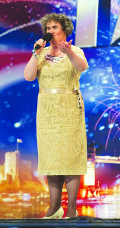 4月11日,沒有接受過任何聲樂訓(xùn)練的蘇珊走上了舞臺。聚光燈下,當(dāng)身材肥胖的她告訴現(xiàn)場所有人她的夢想是成為伊蓮·佩姬(英國音樂劇女神)時,包括評委在內(nèi)的所有人都狂笑不已。但當(dāng)她一開口之后,眼神立即變得柔情萬種,歌聲中具備了驚人的爆發(fā)力與磁性……從那時起,先前的笑聲戛然而止,現(xiàn)場除了掌聲便是尖叫!一曲唱罷,觀眾們紛紛起立熱烈鼓掌,幾個歲數(shù)很大的觀眾偷偷用手擦去感動的眼淚。評委之一的西蒙驚訝得張大了嘴巴;評委皮爾斯·摩根更直呼:“現(xiàn)在沒人笑你了,你的表演震撼、無與倫比!而你更是我們這個節(jié)目開辦三年來最大的驚喜!”