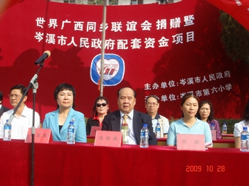岑溪市“世界廣西同鄉(xiāng)聯(lián)誼會(huì)僑愛(ài)小學(xué)”新建教學(xué)樓項(xiàng)目位于岑溪市第六小學(xué),于2009年4月動(dòng)工,由世界廣西同鄉(xiāng)聯(lián)誼會(huì)捐贈(zèng)30萬(wàn)港元,岑溪市人民政府配套資金建成。受世界廣西同鄉(xiāng)聯(lián)誼會(huì)委托,自治區(qū)僑辦負(fù)責(zé)該項(xiàng)目的組織、督建和落實(shí)工作。作為廣西區(qū)“僑愛(ài)工程”項(xiàng)目之一,岑溪市第六小學(xué)樹(shù)起了“世界廣西同鄉(xiāng)聯(lián)誼會(huì)僑愛(ài)小學(xué)”的牌子。