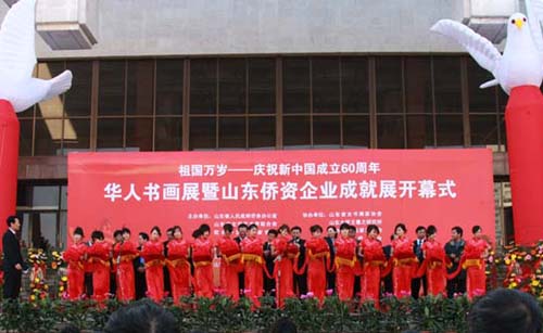 中新網(wǎng)11月10日電 據(jù)山東省僑辦消息,“祖國(guó)萬(wàn)歲——慶祝新中國(guó)成立60周年華人書畫展暨山東僑資企業(yè)成就展”大型宣傳展覽活動(dòng)11月6日在濟(jì)南拉開(kāi)帷幕。國(guó)務(wù)院僑辦副主任馬儒沛、省政協(xié)副主席李德強(qiáng)、著名書畫家劉寶純出席活動(dòng)開(kāi)幕式并為活動(dòng)剪彩。省僑辦主任王琳在開(kāi)幕式上致辭,省僑辦黨組書記朱緒平主持開(kāi)幕式。