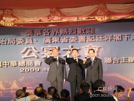 泰國(guó)國(guó)務(wù)部部長(zhǎng)李天文,泰中經(jīng)濟(jì)文化委員會(huì)主席披尼•乍魯頌巴,中國(guó)駐泰國(guó)大使管木以及廣東省委常委、廣州市委書記朱小丹,廣東省副省長(zhǎng)萬(wàn)慶良等廣東代表團(tuán)全體成員以及省直有關(guān)單位和各市經(jīng)貿(mào)團(tuán)負(fù)責(zé)人、泰國(guó)中華總商會(huì)主席吳宏豐博士、泰國(guó)潮州會(huì)館主席陳漢士博士等泰華各界僑領(lǐng)共600多人出席了當(dāng)晚的歡迎晚宴。