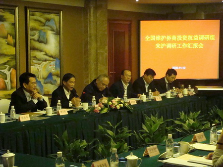 12日下午,上海維護(hù)僑商投資權(quán)益聯(lián)合調(diào)研工作匯報(bào)會(huì)和僑商座談會(huì)在上海衡山賓館召開。上海市僑辦主任崔明華向調(diào)研組匯報(bào)了上海維護(hù)僑商權(quán)益工作的基本情況、基本做法、主要體會(huì)和工作建議。上!拔鍍S”及相關(guān)委辦局的負(fù)責(zé)人參加匯報(bào)會(huì)并介紹上海各部門維護(hù)僑商權(quán)益工作情況。