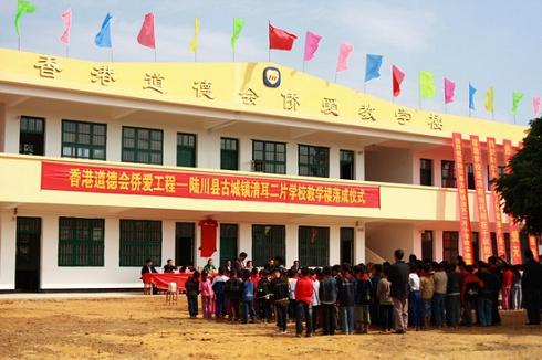 中新網(wǎng)11月19日電 據(jù)廣西僑辦消息,11月13日,廣西陸川縣古城鎮(zhèn)清耳小學(xué)二片分校校園里,彩旗飄揚(yáng),鑼鼓喧天,鞭炮齊鳴,由香港道德會(huì)無(wú)償捐贈(zèng)32萬(wàn)元興建的“香港道德會(huì)僑愛(ài)教學(xué)樓”勝利落成。