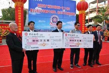 慶典現(xiàn)場(chǎng)上,鄺文熾先生以97歲的高齡,真情訴說著紅藍(lán)兒女與培正的綿綿情意,在展望臺(tái)山培正學(xué)校美好未來時(shí),鄺老當(dāng)即現(xiàn)場(chǎng)捐出人民幣100萬元,這一義舉引來一片喝彩,也讓在場(chǎng)人士無不為之動(dòng)容。在他的帶動(dòng)下,培正校友陳國(guó)強(qiáng)先生也現(xiàn)場(chǎng)捐資100萬元,為臺(tái)山培正的發(fā)展再添力量。