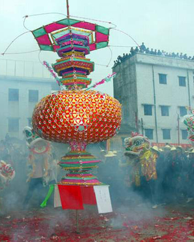 “泮村燈會(huì)”始于明朝英宗天頤八年(公元1464年,農(nóng)歷甲申年)正月十三日,至今500多年。每年農(nóng)歷正月十三,開平市水口鎮(zhèn)泮村舉行舞燈盛會(huì),今年當(dāng)?shù)赜瓉?lái)了第十一屆舞燈盛會(huì)。當(dāng)天上午,3個(gè)三米多高的大花燈,以羅傘彩旗開路,龍獅共舞,鞭炮齊鳴,巡游于泮村48條自然村,全過(guò)程包括扎燈、送燈、起燈、舞燈、打燈,故擇其名為“泮村燈會(huì)”。